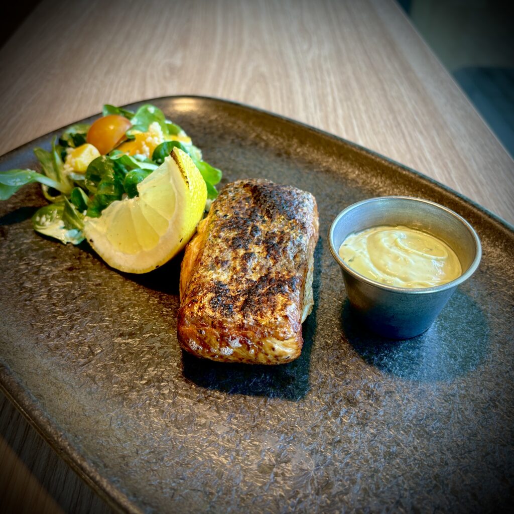 BBQ lõhe, Mango kuskussi salat, basiilikumajonees.