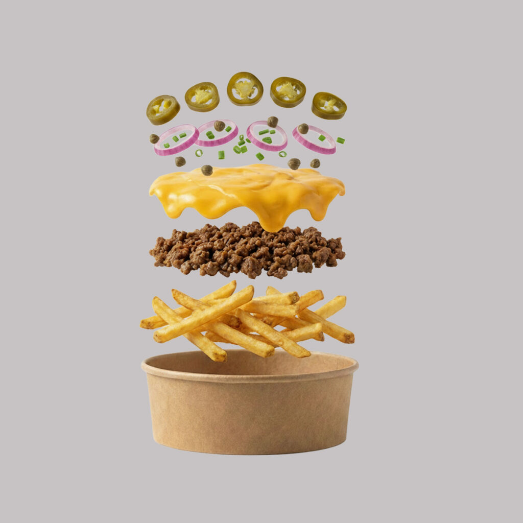 Friikartulid, veisehakkliha, cheddar juustukaste, marineeritud- ja roheline sibul. kapparid, jalapeno.