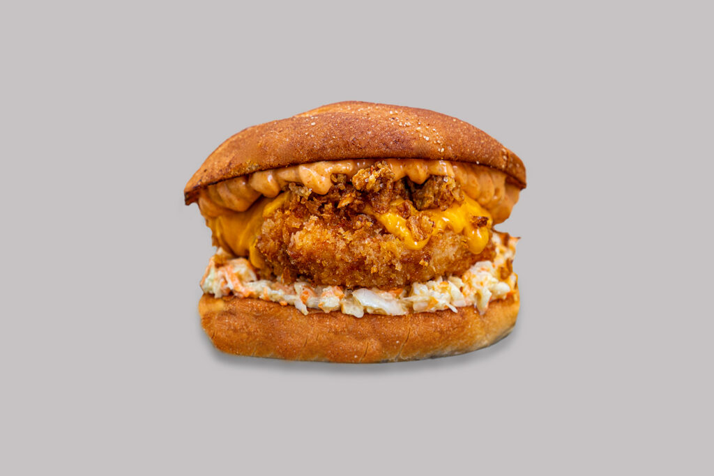 Krõbekana, kartuli burgerisai, Coleslaw salat, juust, krõbesibul, Rocco’s kaste.