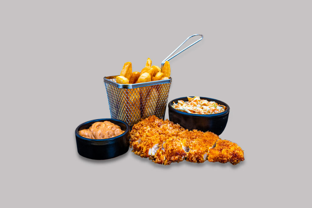 Kanaliha, Coleslaw salat, friikartulid, Rocco’s kaste.